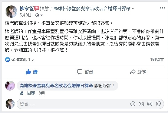 還有、日前有個客人從後勁來找我結婚擇日,也跟我說他本來在「大師算算」那裏找了個命理師,結果說結婚擇日費用要5千元,他當場就離開了。那個客人說他後來是問朋友,朋友推薦松濠堂陳老師的,那個客人問我說:「陳老師您有出書有授課、在本地還那麼有名,為什麼收費那麼便宜?」
